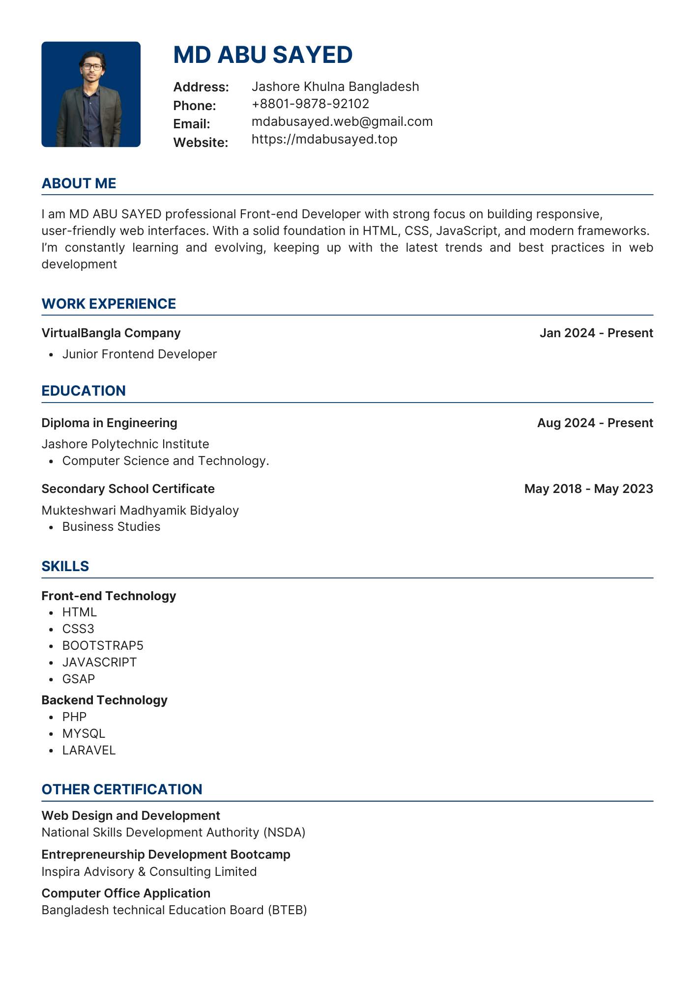 " Abu Sayed has strong knowledge of HTML, CSS, JavaScript, and frameworks like Bootstrap and Tailwind. The websites he builds are fast, responsive, and visually appealing. "